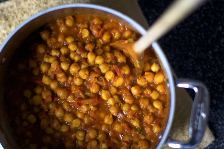 4. Add boiled chickpeas with 1 cup water. Simmer for 10–12 minutes.